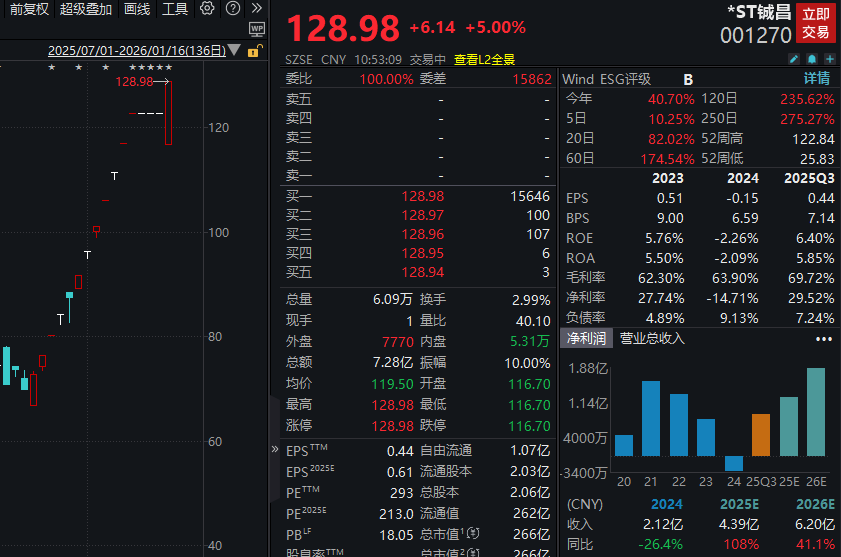 *ST铖昌(001270)今日开盘后秒速“地天板”,该股在停牌前的11个交易日内,收获10个涨停板红太阳配资,加上今日共收获11个涨停板。该股是近期商业航天概念的大牛股,公司曾在此前的异常波动公告中表示,商业航天行业处于产业初期阶段,低轨卫星星座的批量发射、组网进度及节奏尚存在不确定性,并于1月13日停牌核查,今日发布核查结果并复牌,公司表示,公司股票短期涨幅高于同期行业及上证涨幅,但公司基本面未发生重大变化,存在较大的交易风险。
