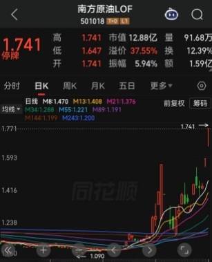 截至午间收盘,南方原油LOF报1.741,大涨10%,连续第二个交易日涨停,今日成交1.59亿元,溢价率高达37.55%。